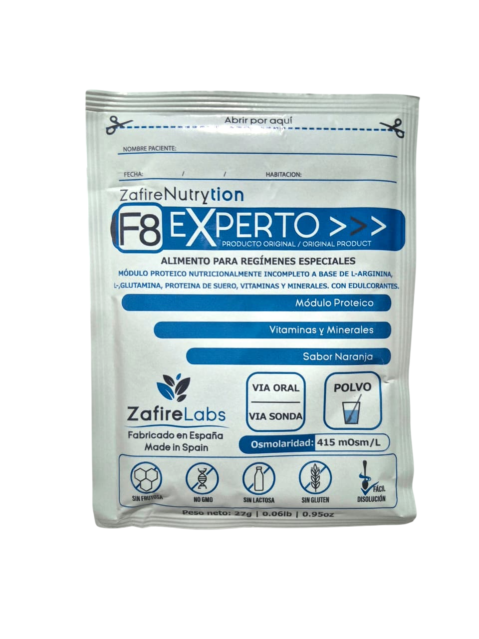 El F8 EXPERTO es un suplemento nutricional especializado para cicatrizacion de heridas a base de Arginina, Glutamina, Vit. A, C, E, B6, B12, Cobre, Selenio, Zinc, Sobre de 27 gramos.